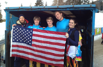 From left, Coach Pat Anderson, Pat Edmunds, Tucker West, Ty Andersen and Summer Britcher in the back of the transport truck at the luge track in Igls, Austria. Photo: West family